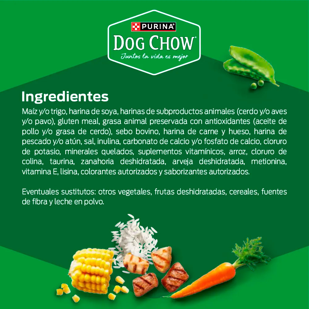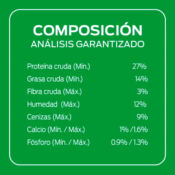 Maíz, harinas seleccionadas (pollo, res y/o cerdo), trigo y/o sorgo, grasa animal preservada (res y/o cerdo y/o pollo) como fuente de omega 6, soya, gluten de maíz, hidrolizado de pollo y/o cerdo, harina de atún y/o harina de alga (Schizochytrium sp.) como fuentes de ácidos grasos omega 3 y DHA, arroz, sal*, inulina (prebiótico) y/o pared celular de levadura (Saccharomyces cerevisiae ssp.), cloruro de potasio, ortofosfato de calcio y/o carbonato de calcio y/o sorbato de potasio, suplemento vitamínico antioxidante [A, B1, B2, B3,B5, B6, B7, B9, B12, D3, E, K3, BHT], cloruro de colina, minerales [(sulfatos: zinc, hierro, manganeso, cobre, magnesio), minerales de alta absorción (proteinato de zinc y/o complejo de zinc-glicina, proteinato de hierro y/o complejo de hierro-glicina, proteinato de manganeso y/o complejo manganeso-glicina, proteinato de cobre y/o complejo de cobre-glicina, proteinato de selenio y/o complejo de selenio-glicina), selenito de sodio, yodato de calcio o yodato de potasio], aminoácidos (L-lisina, DL-metionina, taurina), zanahoria, chícharo, colorante caramelo natural.